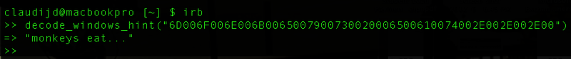 In first looking at the storage location here, I was a little disappointed thinking that the hint was encrypted in some way until I noticed the pattern of zeros. Having dealt with a fair amount of PHP malware in the last couple months, one of things the “baddies” do is chunk up their payload data into individual characters and then encode them in their ASCII numerical representation. Well in looking at this registry value, it seemed to follow a similar approach, so I wrote a little decoder in Ruby to see if I could learn this users password hint.