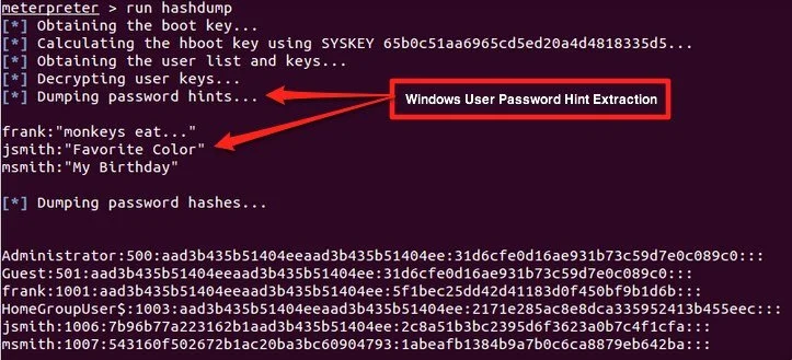Well… being the impatient weirdo that I am, I could not wait and dove in headfirst as soon as I got home that night. This blog post will cover some of the details on how to extract/decode User Password Hints from the Windows registry and how I extended Metasploit’s Hashdump tools to incorporate this information.